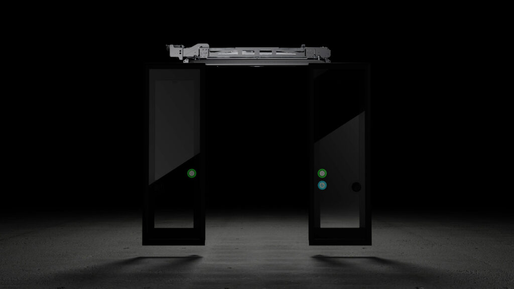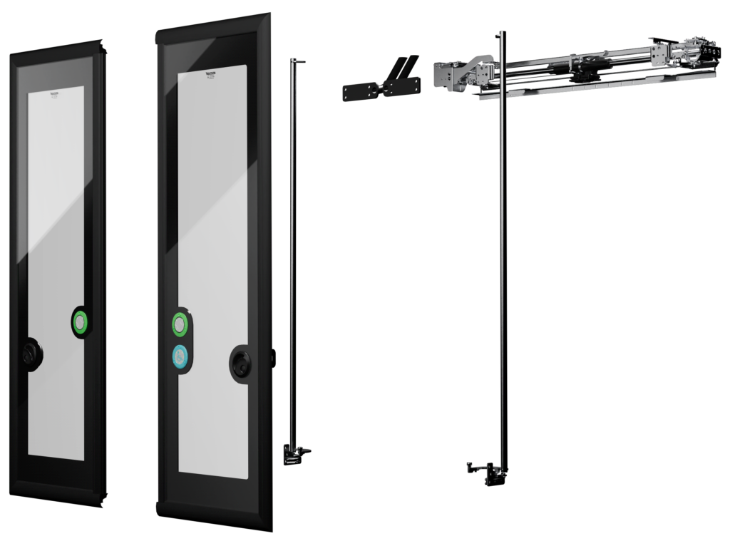 The compact, lightweight design of the 2nd generation mechanism offers high reliability with a minimum of parts. The mechanism is designed to function with a pneumatic or electric actuator which can easily be swapped. This makes the step from pneumatic to electric power very easy. The 2nd generation mechanism is also perfectly suited for low height portals, for example in a double-decker bus.
